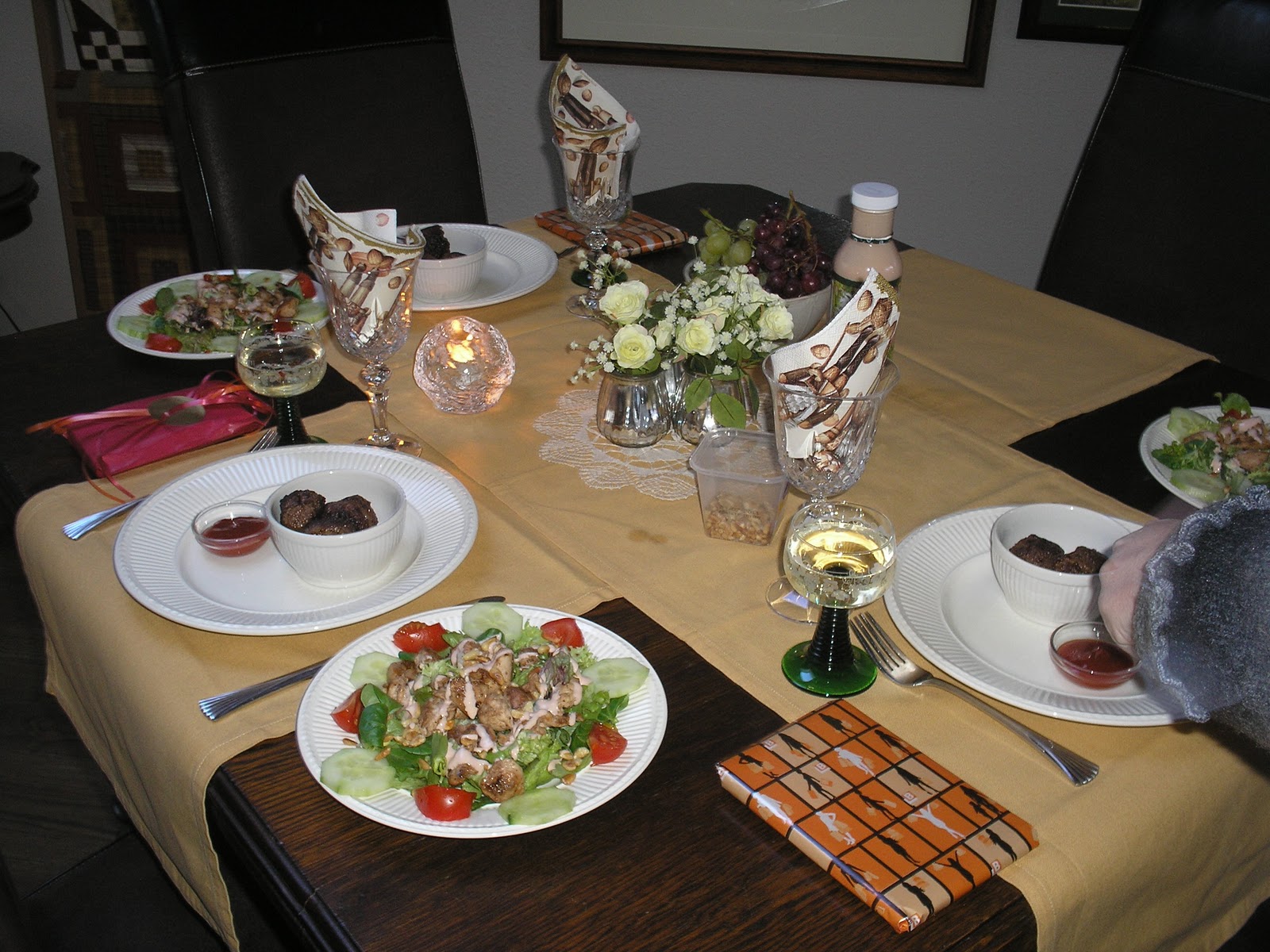 Maar het sloot goed op elkaar aan. Heidi had heerlijke gehakballetjes met een olijf erin, Bep had gekruid gehakt in bladerdeeg en ik had een kipsalade met tomaat/komkommer en pijnboompitjes.